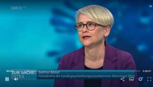 Sabine Maur, Präsidentin der Landespsychotherapeutenkammer Rheinland-Pfalz, war als Studiogast zu einer Sondersendung des SWR zum Thema „5 Jahre Corona- Was bleibt?“ eingeladen. Weitere Gesprächspartner*innen in der länderübergreifenden Sendung vom 27.03.2025 waren unter anderem Clemens Hoch (Gesundheitsminister Rheinland-Pfalz), Manfred Lucha (Gesundheitsminister Baden-Württemberg), Lisa Federle (Notärztin und ehemalige Pandemiebeauftrage Kreis Tübingen) sowie eine Long-Covid-Patientin.