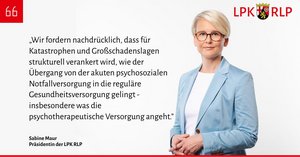 Der Opferbeauftragte, die Kammern, die Kassenärztliche Vereinigung sowie Politik, Krankenkassen und Kliniken haben nach der Flutkatastrophe im Ahrtal große Anstrengungen unternommen, um den Betroffenen psychotherapeutische und psychiatrische Hilfen zukommen zu lassen. Solche Hilfen und der Zugang dazu dürfen aber zukünftig nicht mehr von der zufälligen Einsatzbereitschaft einzelner abhängen, sondern müssen strukturell im Katastrophenschutz verankert werden, forderte Sabine Maur.