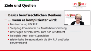 Das Webseminar "Berufsrecht für Kinder-und Jugendlichenpsychotherapeut*innen", das die Landespsychotherapeutenkammer Rheinland-Pfalz für ihre Mitglieder am Freitag, 02.07.2021 angeboten hat, war ein voller Erfolg. Die rund 70 Teilnehmer konnten zahlreiche Fragen stellen, die fachkundig von den beiden Referentinnen beantwortet wurden.