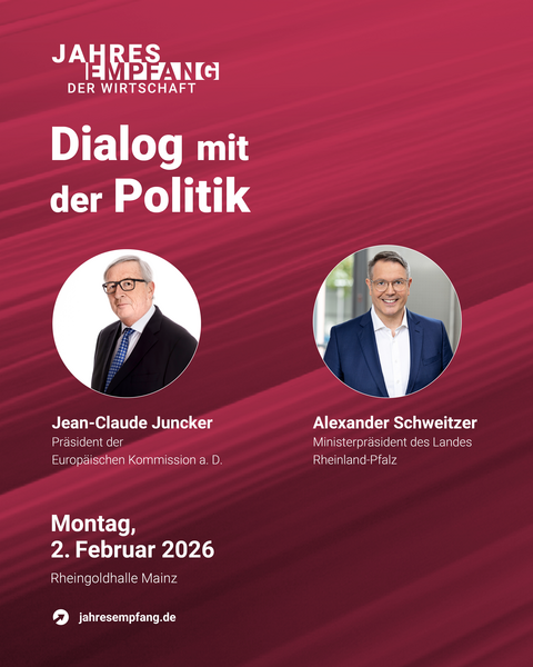 Wir freuen uns darauf, auch 2026 gemeinsam mit 14 anderen rheinland-pfälzischen Kammern und Institutionen der Wirtschaft, des Handwerks, der Freien Berufe und der Landwirtschaft zum großen Jahresempfang der Wirtschaft einzuladen. Der Empfang findet am Montag, 2. Februar 2026, in der Mainzer Rheingoldhalle statt, diesmal mit Jean-Claude Juncker (ehemaliger Präsident der Europäischen Kommission) als Gastredner und Alexander Schweitzer, Ministerpräsident des Landes Rheinland-Pfalz.