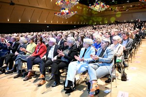 Jean-Claude Juncker sprach in seiner Rede über die Rolle Europas vor der veränderten geopolitischen Kulisse und erinnerte die Zuhörer*innen daran, dass Europa sehr klein ist. Ein geschlossenes Auftreten sei daher umso wichtiger, ebenso wie Allianzen und Freihandelsabkommen mit anderen Partner*innen, nicht zuletzt um Trump die Stirn zu bieten. Demokratiefeinden solle Europa entschlossen entgegentreten. „Wir dürfen Europa nicht den Populisten und den extremen politischen Kräften überlassen“, so Junker und richtete eine Warnung an die Parteien: „Wer den Populisten nachläuft, wird selbst zum Populisten. Wer so redet wie die, wird wie die.“ Junker beklagte, dass die Berichterstattung sich meist auf Negatives konzentriere und zu wenig über die Erfolge Europas gesprochen würde. Wichtig seien jedoch „Aufbruch und Mut und die Freude am Selbst“. Seine Rede, die trotz des ernsten Themas sehr humorvoll und warmherzig war, wurde mit großem Applaus gewürdigt.
